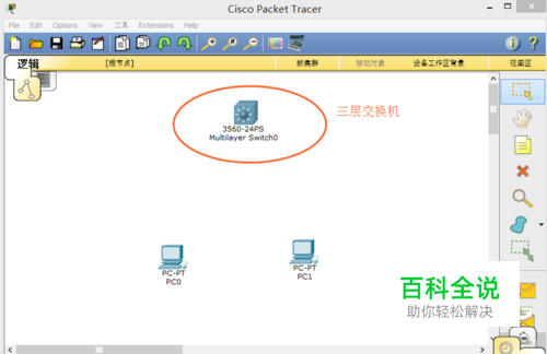 首先打开思科模拟器软件,找出一台三层交换机和两台PC,如下图所示: