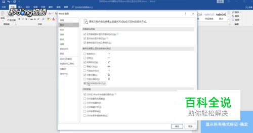 点击“显示”,勾选“显示所有格式标记”,点击“确定”,分页符显示成功。