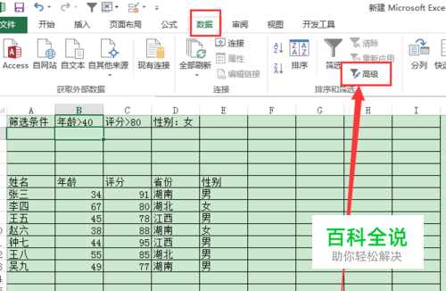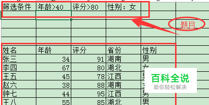 这种直接上案例最合适不过了。 题目:要求筛选年龄大于40且评分高于80的,或者是女的。具体数据如下图