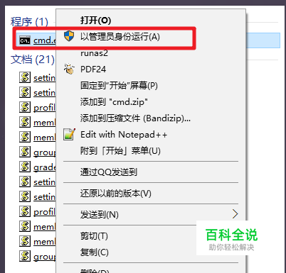 在开始菜单中输入“cmd”,然后 以管理员身份运行;