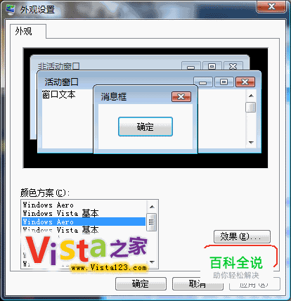 在外观界面中,从颜色方案中选择“Windows Aero”; 点击“高级”按钮;Windows Aero