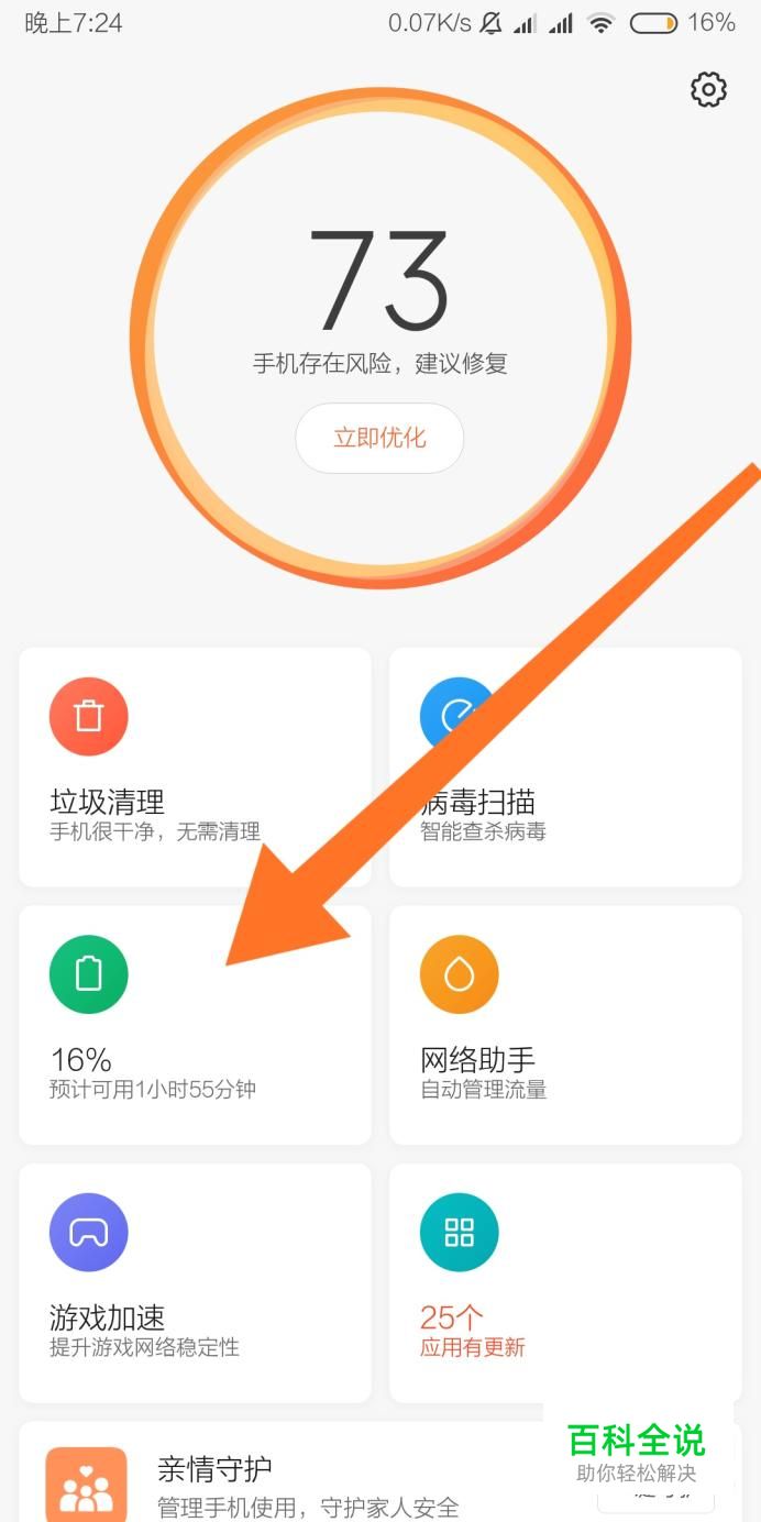 再点击“省电优化”界面右上角的齿轮设置图标。
