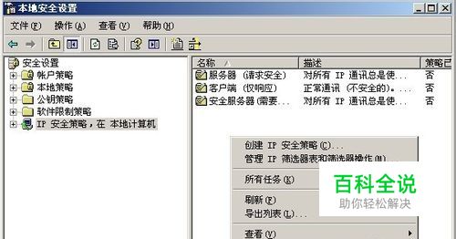 第一步, 点击“开始”菜单/设置/控制面板/管理工具,双击打开“本地安全策略”,选中“IP安全策略,在本地计算机”,在右边窗格的空白位置右击鼠标,弹出快捷菜单,选择“创建 IP安全策略”(如右图),于是弹出一个向导。在向导中点击“下一步”按钮,为新的安全策略命名;再按“下一步”,则显示“安全通信请求”画面,在画面上把“激活默认相应规则”左边的钩去掉,点击“完成”按钮就创建了一个新的IP 安全策略。