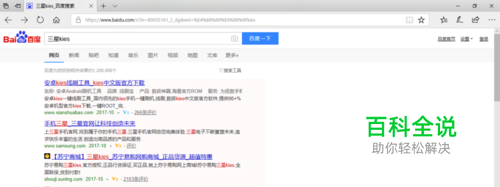 在电脑浏览器搜索空格中输入:三星Kies,回车搜索。下载并且运行相应系统的三星kies,安装三星kies.
