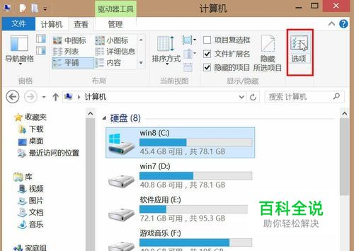 打开 资源管理器-->单击右上角的“选项”打开文件夹选项。