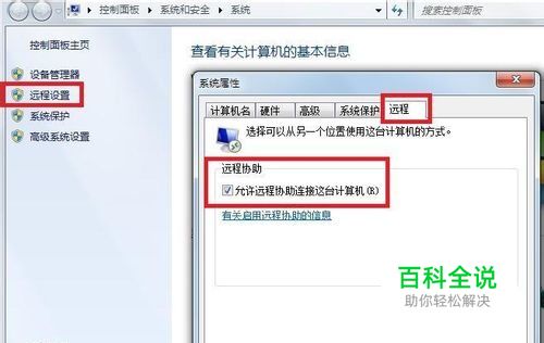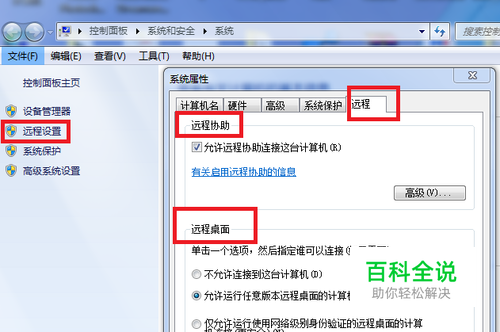 第二步:win7旗舰版系统主机:计算机-属性-远程(同时具有远程协助和远程桌面)如下图