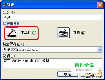 录制“宏”法:单击“工具”→宏→录制新宏,在“录制宏”对话框中的“宏名”框中输入你给宏起的名,“将宏保存在”框中的“所有文档(Normal.dot)”不要改(如图3)。然后在“将宏指定到”项中点“工具栏”按钮,在打开的“自定义”对话框中的“命令”框中将“Normal.NewMacros.落款”拖到工具栏上,最后点“关闭”退出。