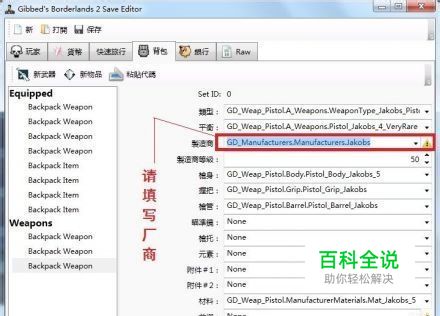 所以,建枪时,记得把厂商代号手工填加进去,这里举一下例子: 如果是你想建造一支JAKBOS (亚各布)公司的枪支,就请依据下图所示红圈位置填上 “ GD_Manufacturers.Manufacturers.Jakobs ” 的字样。以及关键的游戏阶段数也填写上。