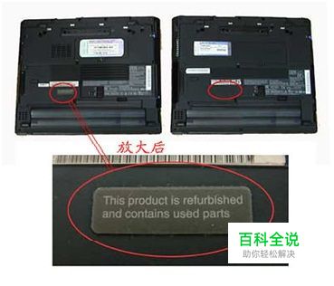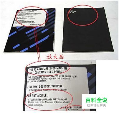 另一个重要标识是在说明书上,如图2所示,在返修笔记本的说明书上,也有类似的标注,左边是返修笔记本电脑的说明书,在封面上有关于返修的相关说明,而右边则是全新笔记本电脑的说明书,封面上没有这种说明,下面为放大的说明部分,请注意划圈的几个地方,上面很清楚的注明了该笔记本内含有使用过的零件,并且保修期为1年。另外在笔记本的包装箱上也有类似标注的标签,所以我们在选择电脑1时也不要忘记检查这几个地方,如果发现了此类标签,即证明该笔记本为返修机。以上所提到的原厂翻新笔记本因为其质量相对来说还算不错,所以对消费者的危害还比较少,而另一类完全是由一些地下作坊里所翻新的笔记本电脑,它们的质量可就完全没有保证了。因为是商家自己翻新,目前就是冒充新笔记本电脑出售,当然也不会在笔记本上留下记号,所以上面所提到的方法针对此类笔记本完全没有作用。
