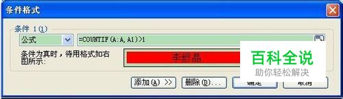 2、点击菜单上的“格式”,“条件格式”,在条件格式对话框中选“条件”,输入“=COUNTIFA:A,A1>1”,条件为真时,待用格式设置为醒目的红色(如图2)。