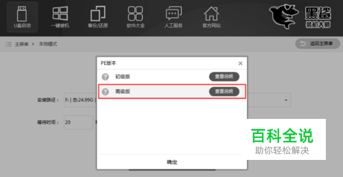 在右下角选择PE版本。黑鲨会提供适合一般用户使用的初级版和可连接网络上网的高级版。下面在此选择的是高级版。