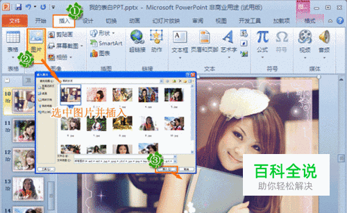 插入照片,点击菜单“插入”--“图片”,打开文件夹找到指定的照片,然后点击“插入”,这样照片会显示有幻灯片上,调整一下图片的大小和位置。