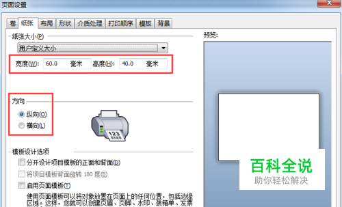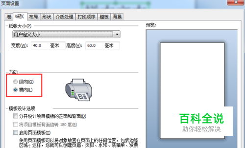 2、所以这第二步则是关键点,需要将纸张大小设置为60*40mm。这样虽然看上去和我们想要的结果不一样,但因为纸张方向为横向,所以实际上它在打印时,整个版面是旋转了90度的。
