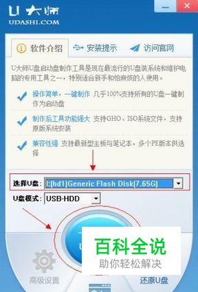 运行“U大师-U盘启动制作工具 .exe”文件,选择对应的U盘作为启动盘,点击“一键制作USB启动盘”。
