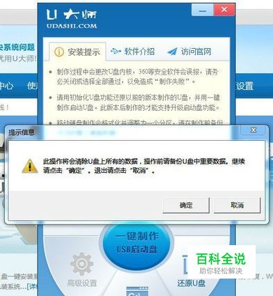 弹出提示框,提示U盘重要数据备份,若U盘有重要数据的可以先单独备份,避免数据丢失,若已经备份则点击“确定”开始制作USB启动盘。