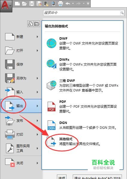 点击CAD的图标,打开菜单,找到输出,点击“其他格式”,如图所示。
