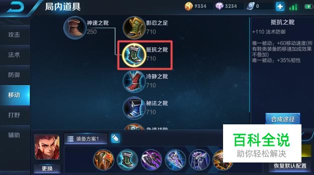 第二件装备我们可以出抵抗之靴,这个装备主要加的是法术防御,一般我们是上单的话,那么对方的中单法师往往会过来偷袭我们,出这个鞋子可以增加我们的移动速度,其次,还能增加法术防御,效果比较好。