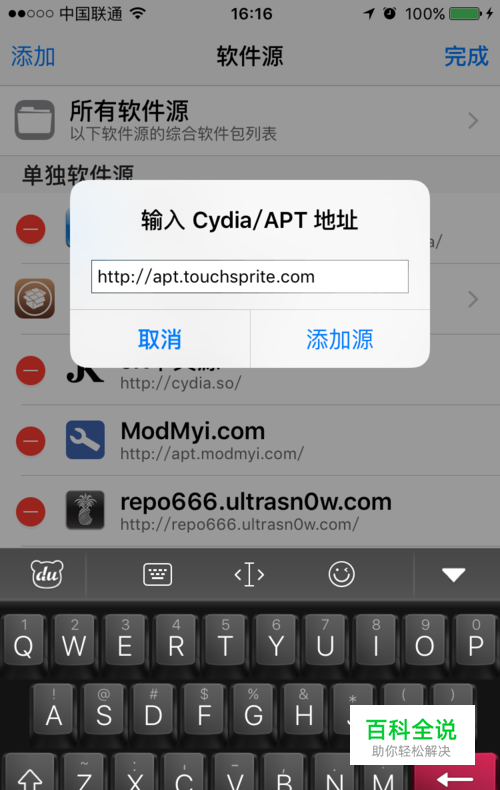 然后继续点击【添加】,在对话框中输入【apt.touchsprite.com】,输入完毕后点击添加源