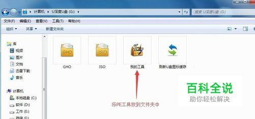 将自己准备的pe工具拷贝至U盘“我的工具”文件夹里,制作好U盘启动盘后会自动出现三个文件夹,我们不用自行创建,如图所示: