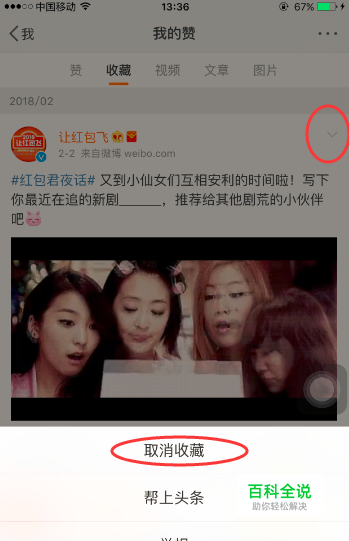 第五,如果之后你又收藏了一条相同知识或者比之前更好的微博, 你可以进入收藏里面,找到之前的那个微博进行【取消收藏】就可以了。