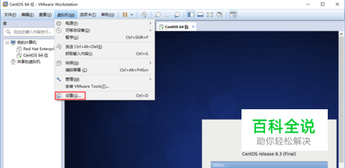 在菜单栏中依次点击:"虚拟机"-->"设置"。