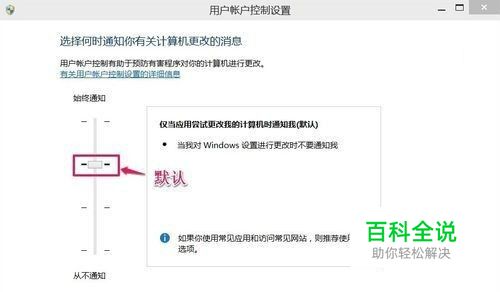 在打开的用户帐户控制设置窗口,我们用鼠标左键按住滑块向上拖动;
