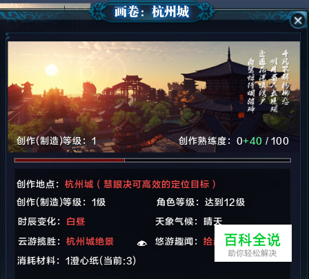 画卷:杭州城,创作地点:杭州城,只要角色位于杭州城当中,都可以进行书画的创作,可选择杭州城的四个城门进行传送。