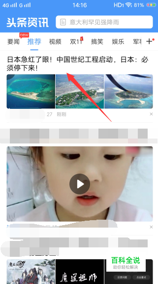 接下来,打开头条资讯内容,里面包含推荐给我们的热门文章和视频,点击一个新闻。