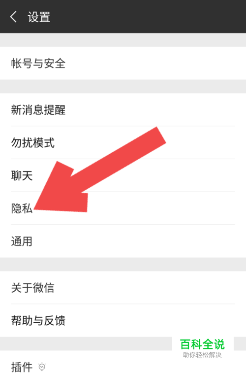 进入设置页面后,点击页面中的“隐私”,进入隐私页面,隐私页面包括两部分的隐私,通讯录和朋友圈。