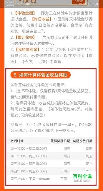 第一步我们首先需要知道余额宝体验金激活时间为昨天15:00到今天15:00前,获得奖励日期为明天,发放奖励日期为后天,需要注意的是不包含节假日和周末,且体验金有体验天数的,详细如下图所示: