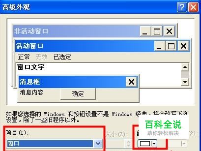 弹出高级外观对话框,在项目栏中选择“窗口”,再点击“颜色”,如图所示