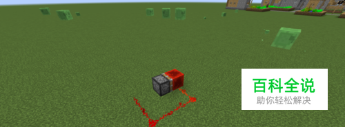 在红石块的右边或左边放一个红石粉末(一定不要把红石粉末放在红石块前面),然后用红石粉末连接到活塞末尾,好第一种我们完成了。(如图)