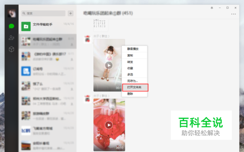 我们可以先通过图片或视频来直接找到文件存放的位置,然后记住这个位置,下次需要的时候找到这个位置就可以啦。首先我们在微信电脑版中找到之前收到的文件的聊天记录,例如在下图中,我找到的一个视频,鼠标右键视频,找到【打开文件夹】,点击进入。