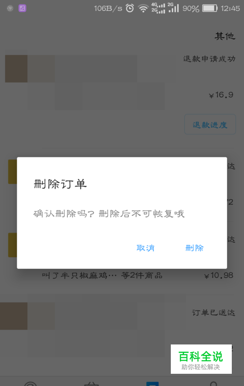 找到要进行删除的订单后就长按住它所在的这一栏,知道出现删除订单的提示窗口。