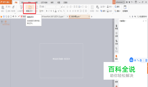 然后我们就选用 WPS 程序将他打开,在程序界面的<开始>菜单工具栏中我们单击<新建幻灯片>,这样我们就创建了一张空白的幻灯片。