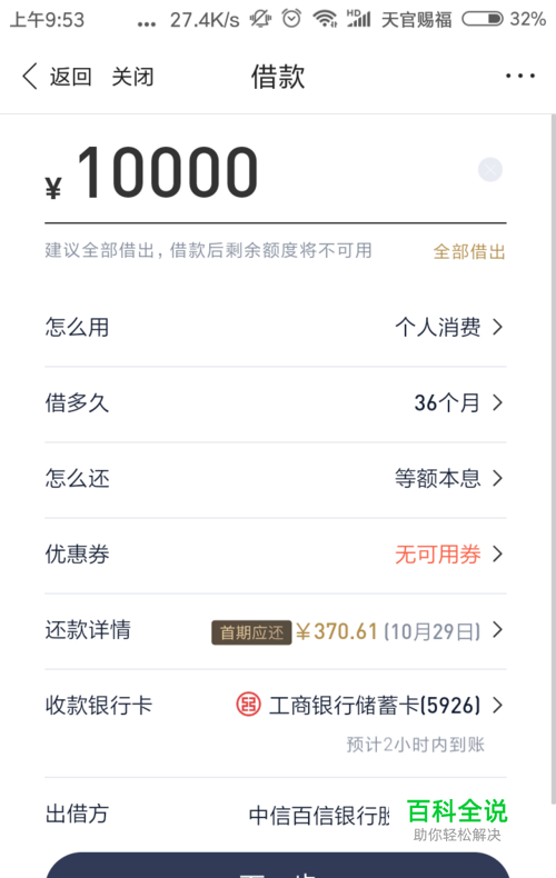 输入需要借钱的金额,然后查看需要偿还的期限,每月还款金额和利息情况。