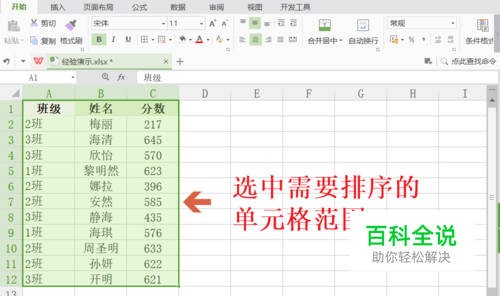 Excel按分数降序/班级升序双条件排列数据