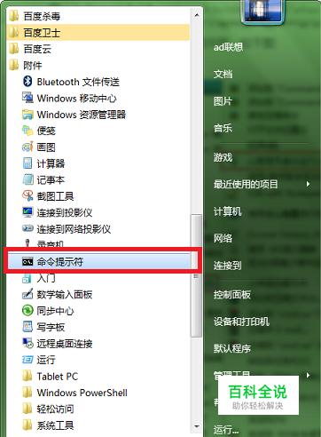 打开“开始”菜单,把鼠标放在“所有程序”上,然后便会列出系统中的所有程序,找到并点击打开“附件”,在其列表中找到“命令提示符”(俗称cmd),点击打开程序。