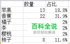 首先,做个示范,制作个水果数量及百分比表格,数量与百分比结果不用看,只做参考;