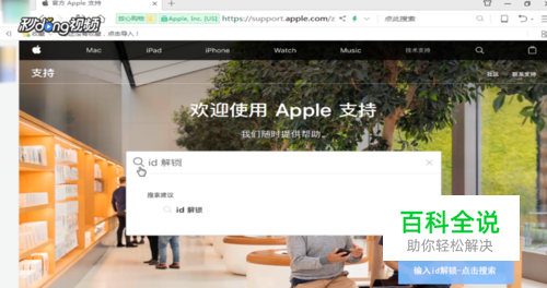 打开苹果官网,点击“技术支持”,点击搜索栏,输入“id 解锁”,点击搜索。