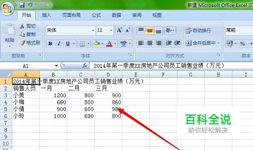 首先录入数据,假设要录入某地产公司2014年第一季度员工的销售业绩表。只需要先照着你原有的数据录入到Excel即可。如下图。