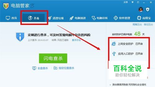 打开腾讯电脑管家——杀毒——右侧点击【上网安全防护】、【应用入口防护】、【系统底层防护】
