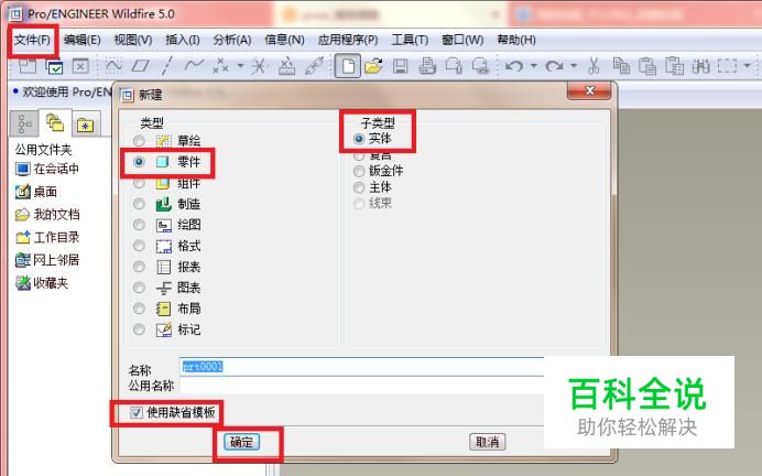 如下图所示,打开Pro/e5.0软件; 然后新建一个实体零件(类型是零件,子类型是实体); 然后尽量勾选“使用缺省模板”; 再然后点击“确定”,实体零件新建成功。
