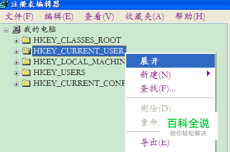 在注册表编译器里,找到“HKEY_CURRENT_USER”选项,单击右键,展开。