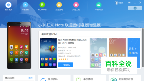 功能体验 在刷机精灵首页第二屏可以快速开启一些常用功能,比如一键ROOT,备份资料,美化字体和跑分评测等,很方便。