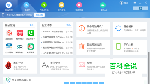 界面风格 打开刷机精灵连接手机之后如下图所示,主流的扁平化UI设计风格想必大家不会陌生,配合刷机精灵独家首创的创意卡片式展示,清新简洁。