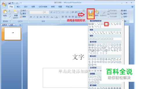 打开PPT软件,新建空白文档后,在内容上输入文字。点击菜单栏上“形状”按钮。在下拉菜单中选择其中一个背景。