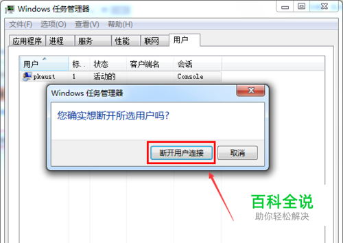 这里会弹出你确实要断开所选用户的连接吗?的警告,点击断开用户连接,如下图所示。