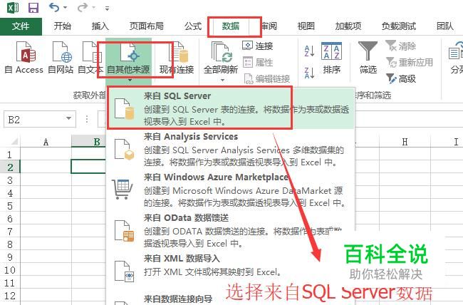 接下来打开Excel软件,点击数据菜单,然后选择其他来源下面的来自SQL Server选项,如下图所示