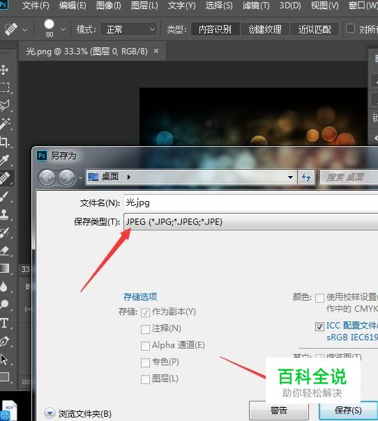 把该图片拉入到PS软件中,然后按Shift+Ctrl+S,弹出另存为对话框,在保存类型处选JPEG,点击保存。